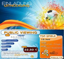 Am 8. Juni ist es soweit, die Fussball EM 2012 in Polen & der Ukraine startet und das BALANCE zeigt alle Spiele live auf einer Leinwand. Ein besonderes Ereignis ist das Vorrundenspiel Holland - Deutschland, dazu planen wir ein besonderes Event, Public Viewing auf einer Großleinwand im Kursraum mit Getränken und warm-kaltem Buffet. Wir freuen uns auf jeden, der bei uns mitfiebert!