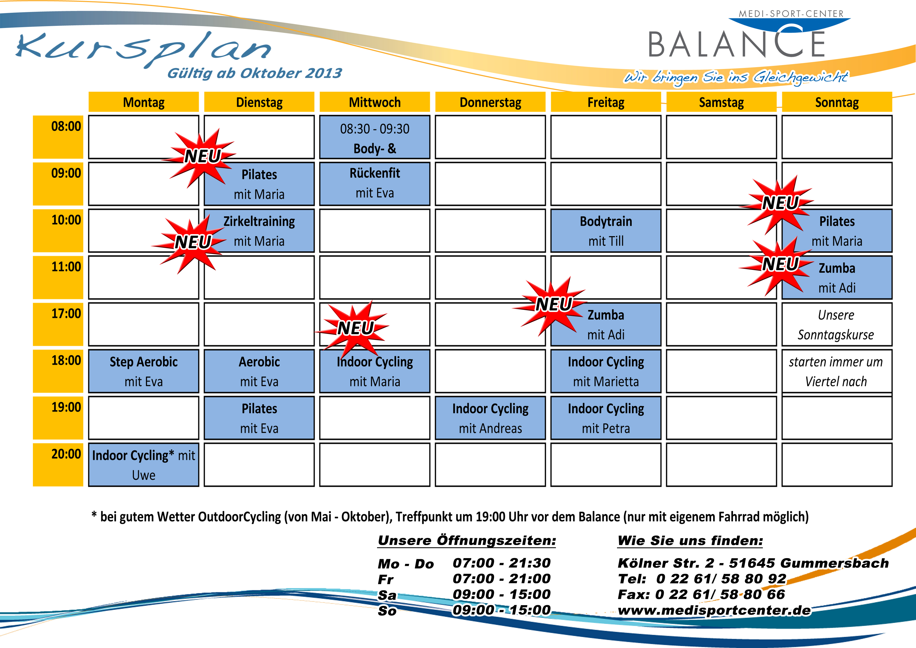 Auf dieser Seite finden Sie unseren aktuellen Kursplan und eine kleine Übersicht über die bei uns stattfindenden Kurse. Alle Kurse können auch über 10er-Karten besucht werden.